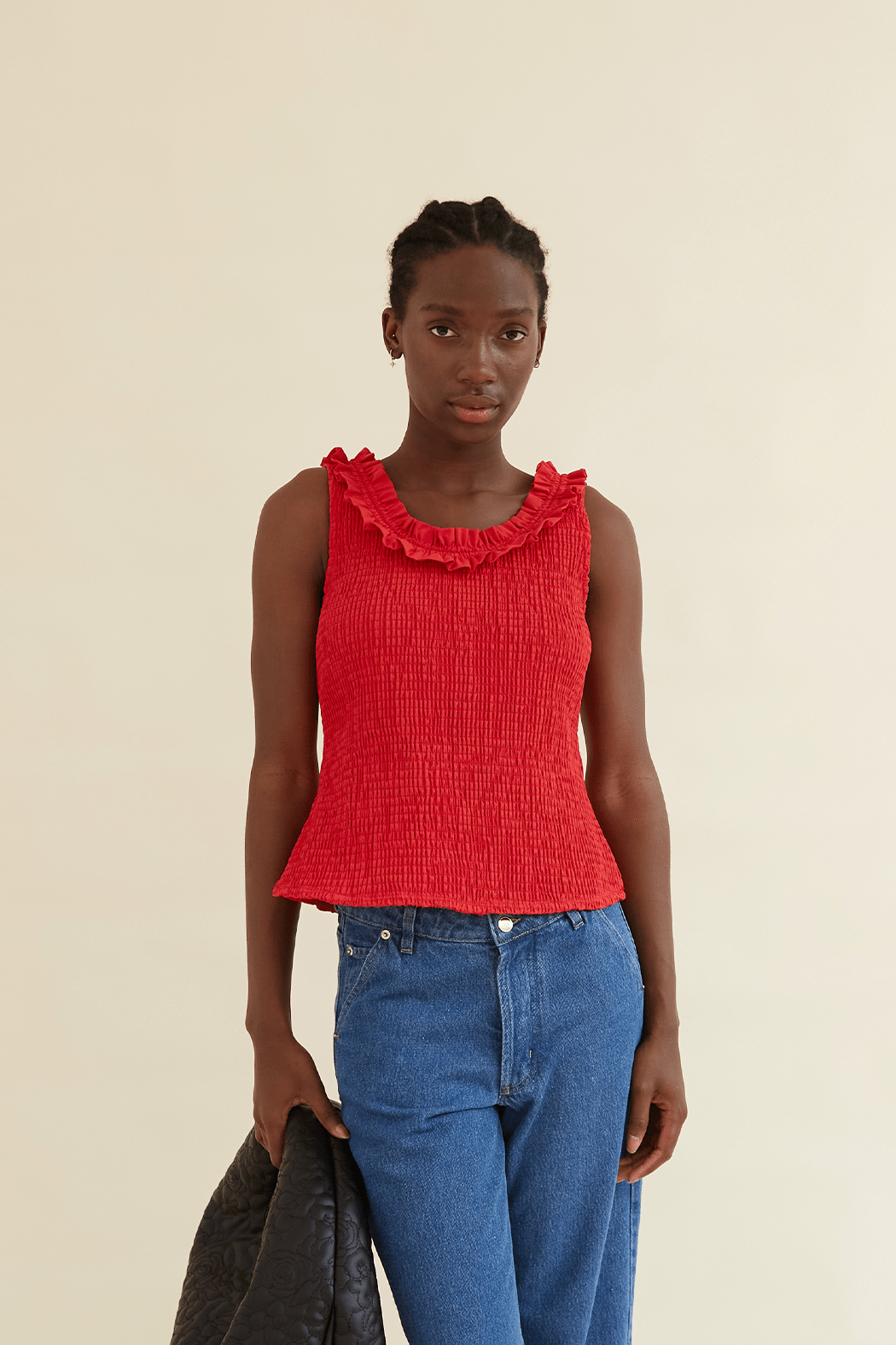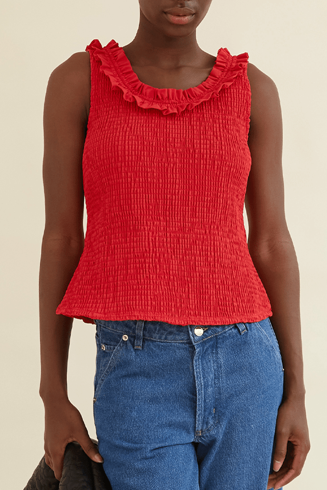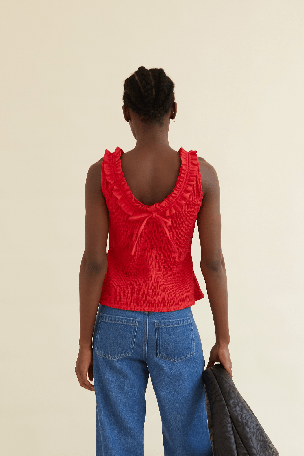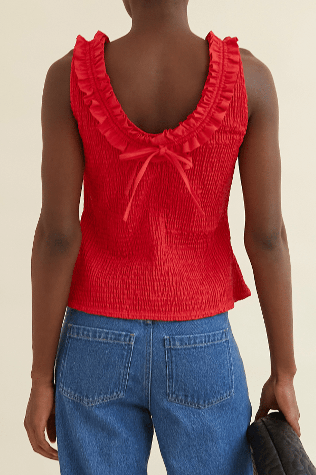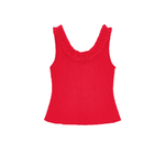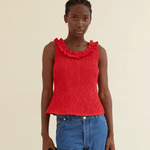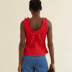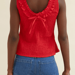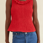 The Zoe Top is crafted from 100% organic cotton and comes in a mars red shade. Designed with a stretchy texture for a comfortable fit, the hem flares out slightly, creating a flattering peplum effect. The ruffled neckline adds a romantic touch, continuing to the back where it ties into an adorable bow.