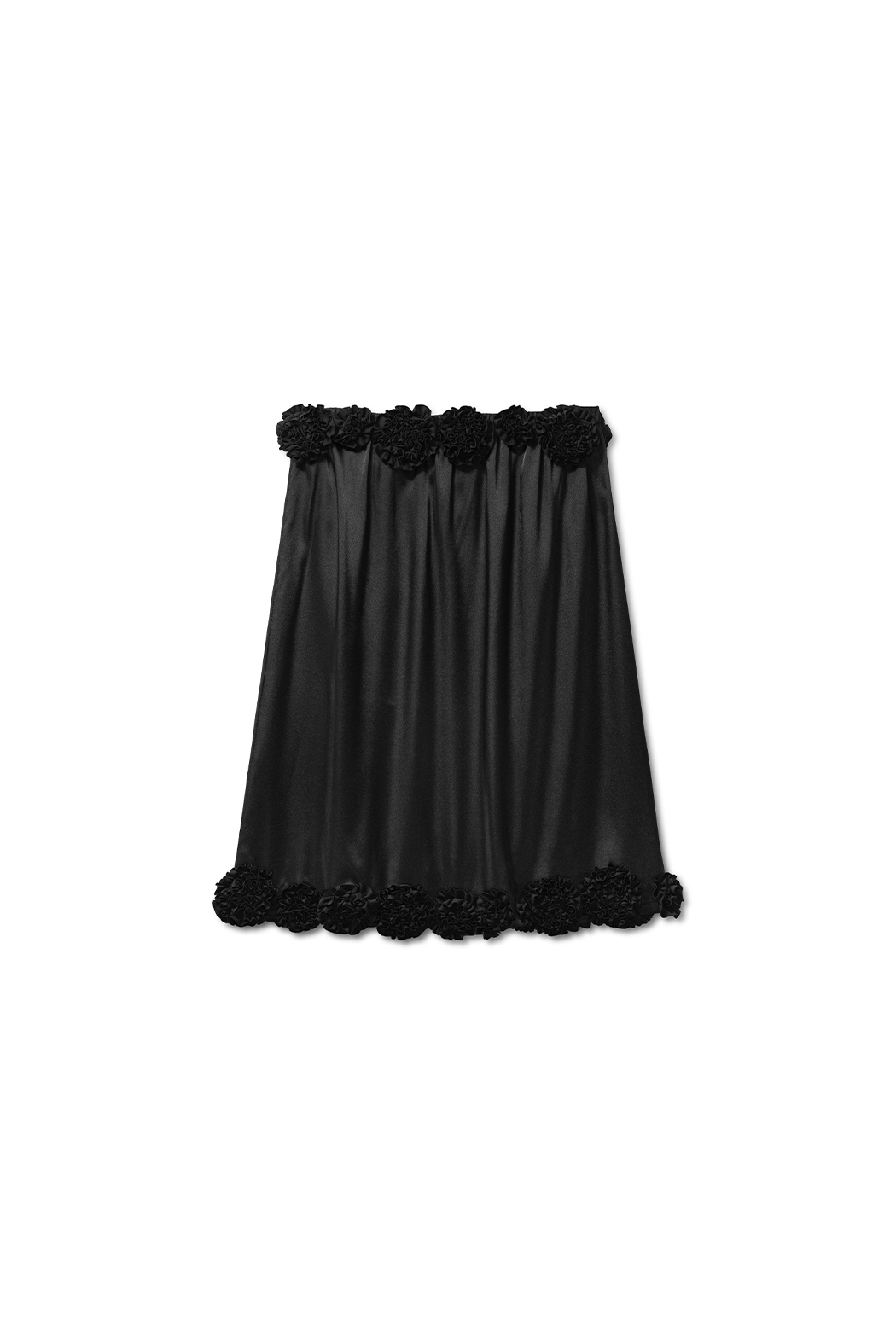 The Hana Skirt is crafted from 100% recycled polyester in black. Designed with decorative floral details at the waist and bottom, it brings a feminine touch to its sleek midi silhouette.