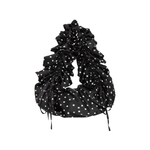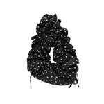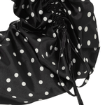 The eye-catching Shirley Bag is crafted from 100% recycled polyester in a black base with white dots. It features an adjustable strap and ruffle detailing. Designed for versatility, it can be worn over the shoulder, crossbody, or styled as a handbag.