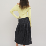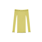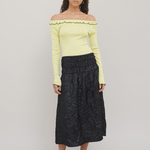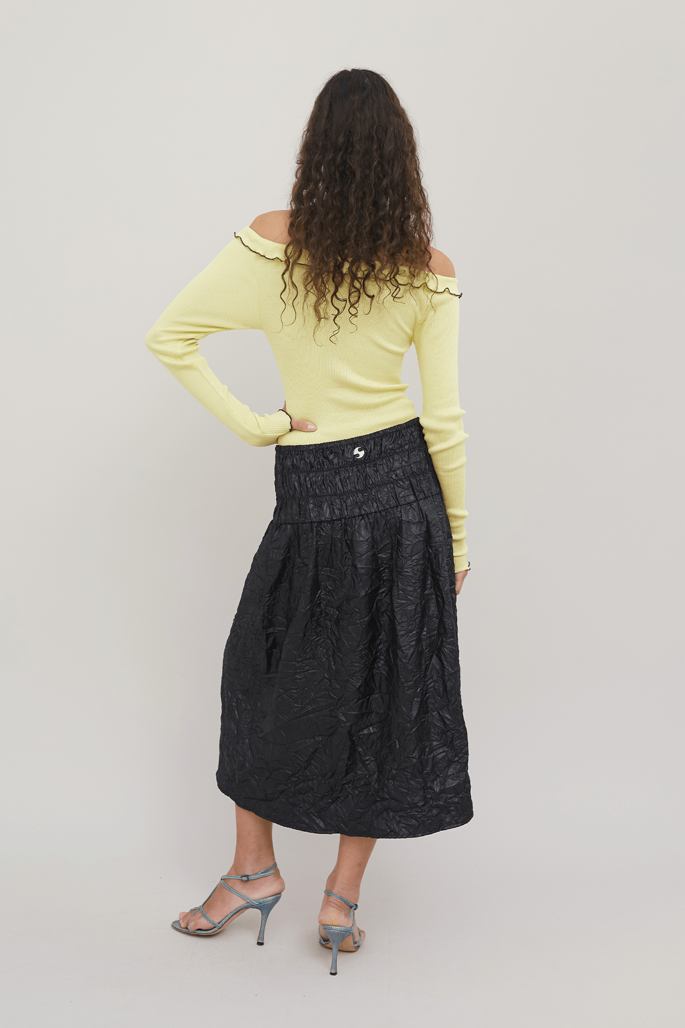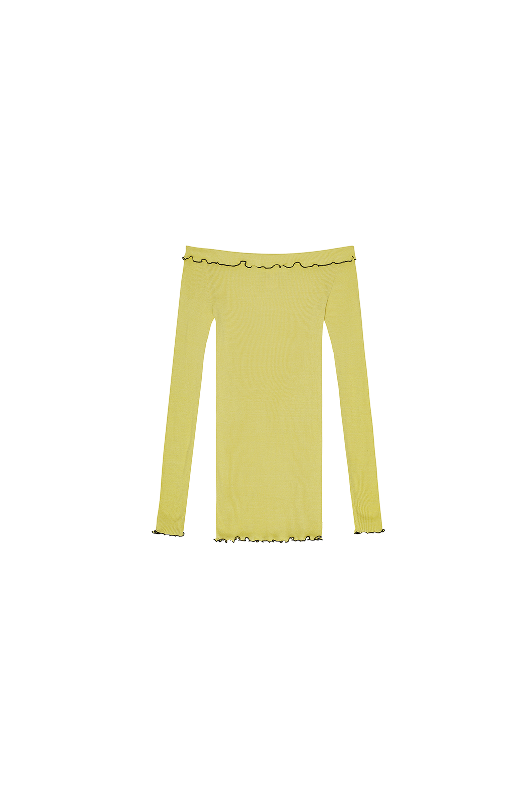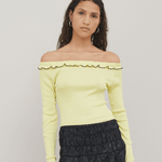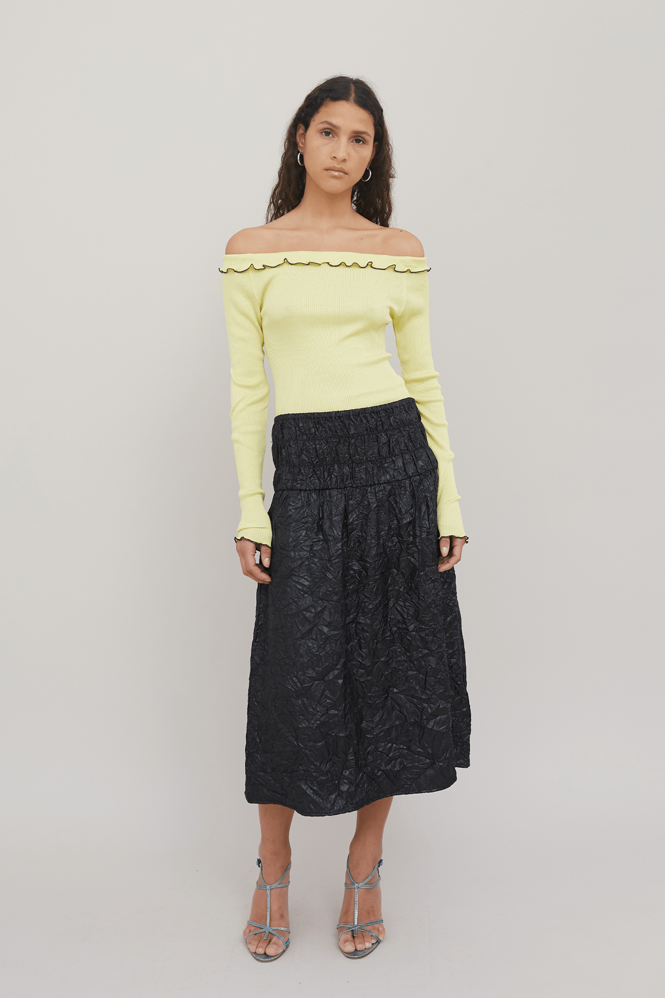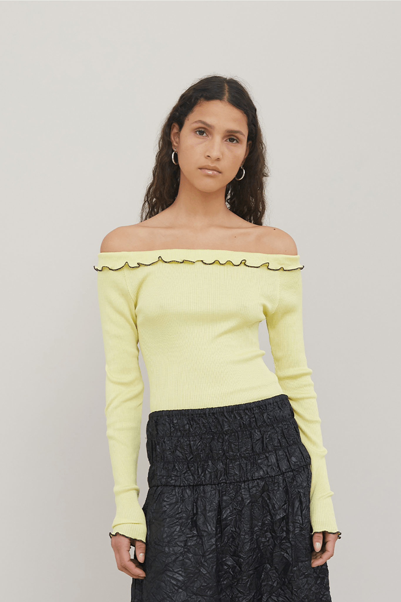This season we are introducing the elegant Leanor top crafted from our signature seamless fabric in 100% recycled silk. The top has a slim fitted silhouette with long sleeves and an off-shoulder design. Leonor has ruffles detailing around the edges made from flower leaves-like seamless silk.