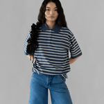 The Luna Unisex Polo T-shirt is made from 100% organic cotton in a newly reimagined navy and off white stripes. It features a half button-up placket, a classic collar, split at the side hems, and OpéraSPORT branding on the chest. With its unisex, oversized fit, it’s designed to flatter all body types, making it a versatile addition to your wardrobe. Comfy and stylish, it’s perfect for any occasion.