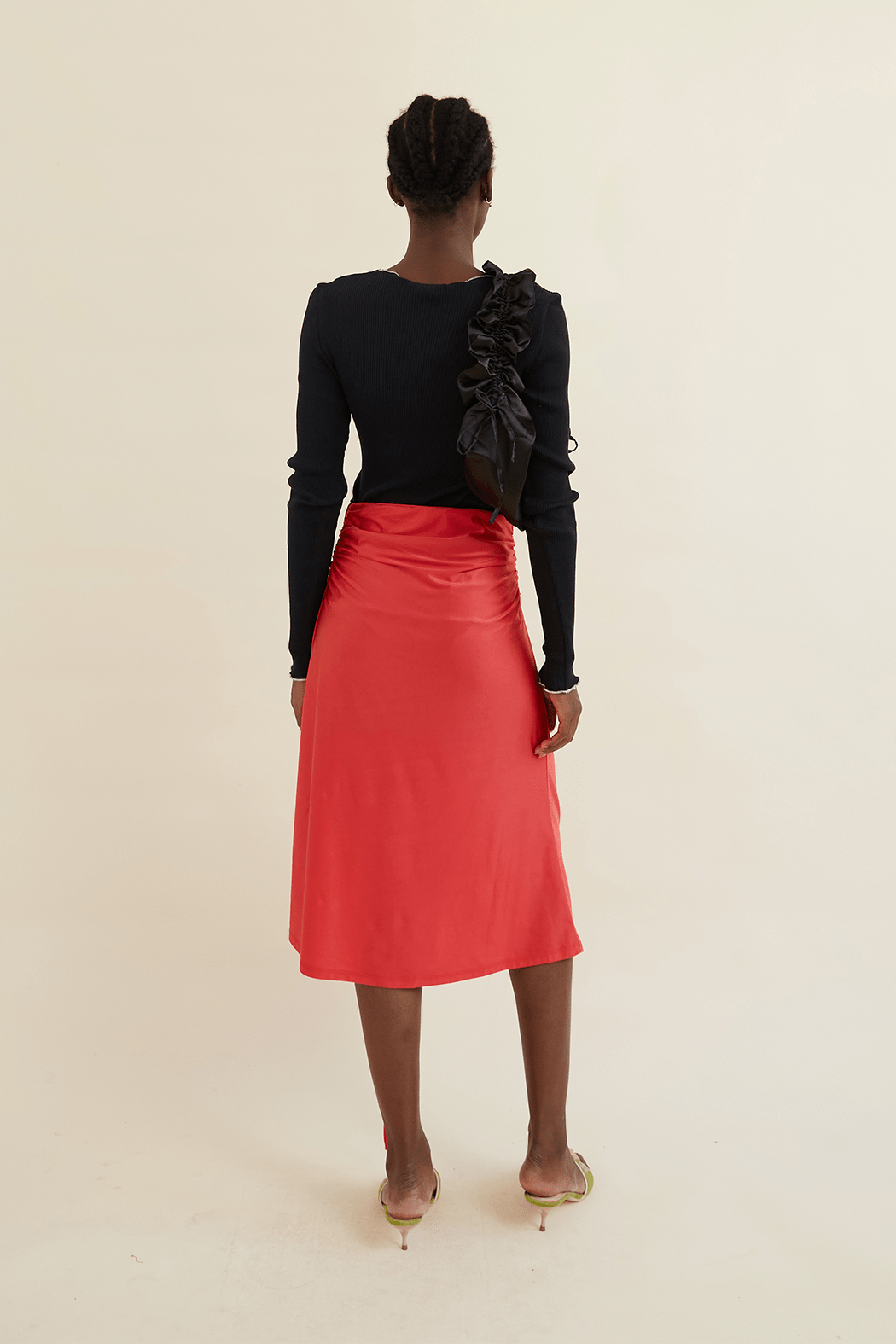 The Agathe Skirt in Mars Red is crafted from a blend of 75% recycled polyamide and 25% spandex, offering stretch for a comfortable fit. With a below-the-knee length, this skirt features ruched detailing on both sides, and a ruffled fabric detail on the right side, that runs along the skirt with an adjustable tie for a playful and customizable design.