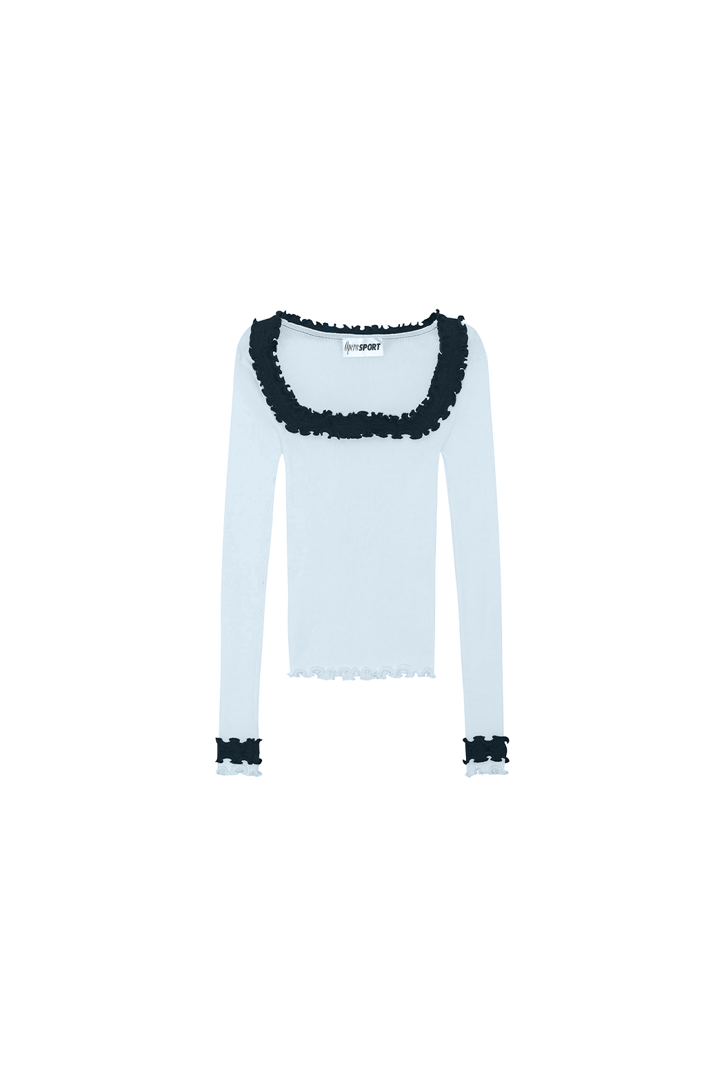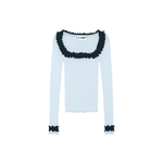 Our Rosie Seamless Top is crafted from soft 100% ice blue organic cotton. The top is all-over ribbed and hugs all shapes and sizes beautifully. The neckline features an open, square-shaped cut-out adorned with a lovely white ruffled edge that extends to the sleeve ends.
