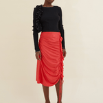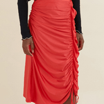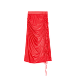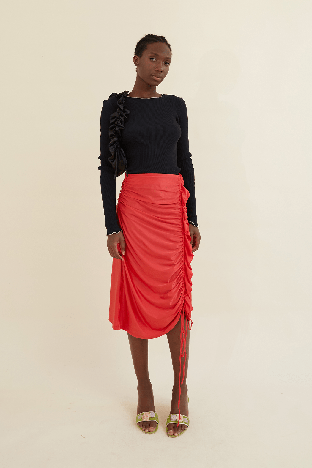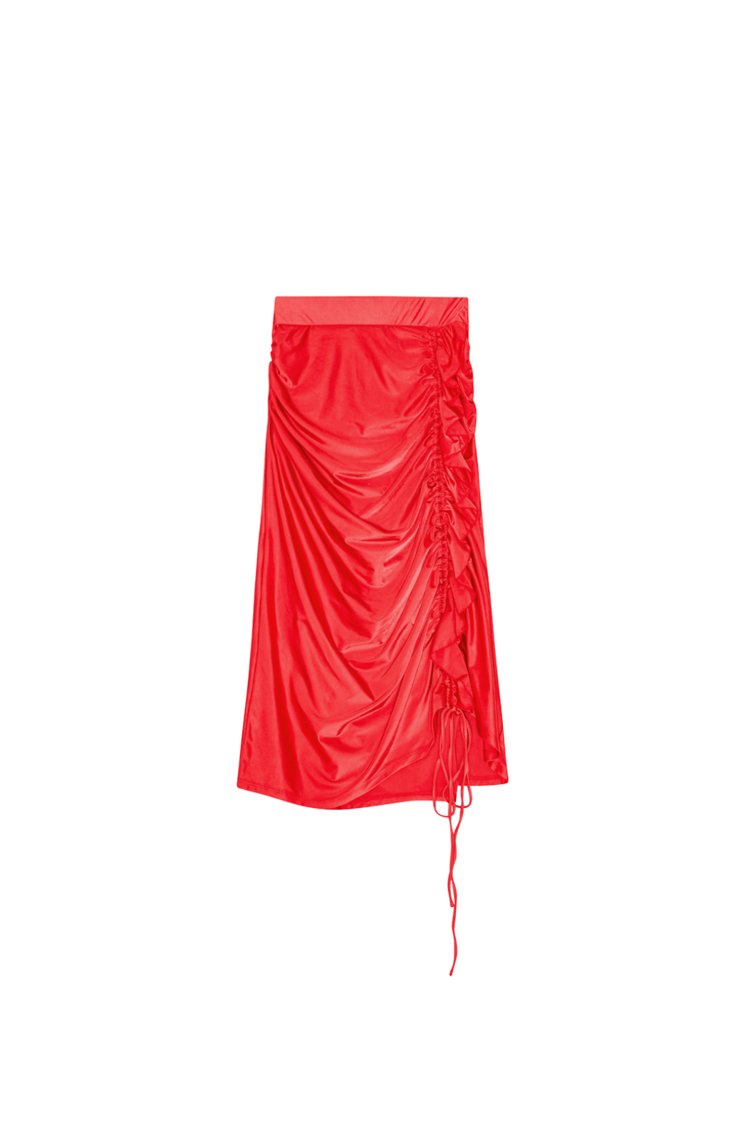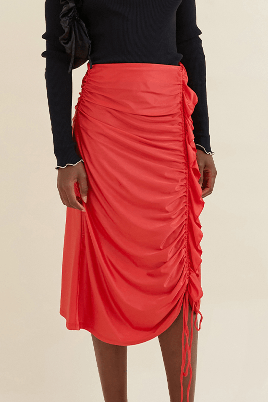 The Agathe Skirt in Mars Red is crafted from a blend of 75% recycled polyamide and 25% spandex, offering stretch for a comfortable fit. With a below-the-knee length, this skirt features ruched detailing on both sides, and a ruffled fabric detail on the right side, that runs along the skirt with an adjustable tie for a playful and customizable design.