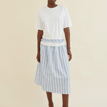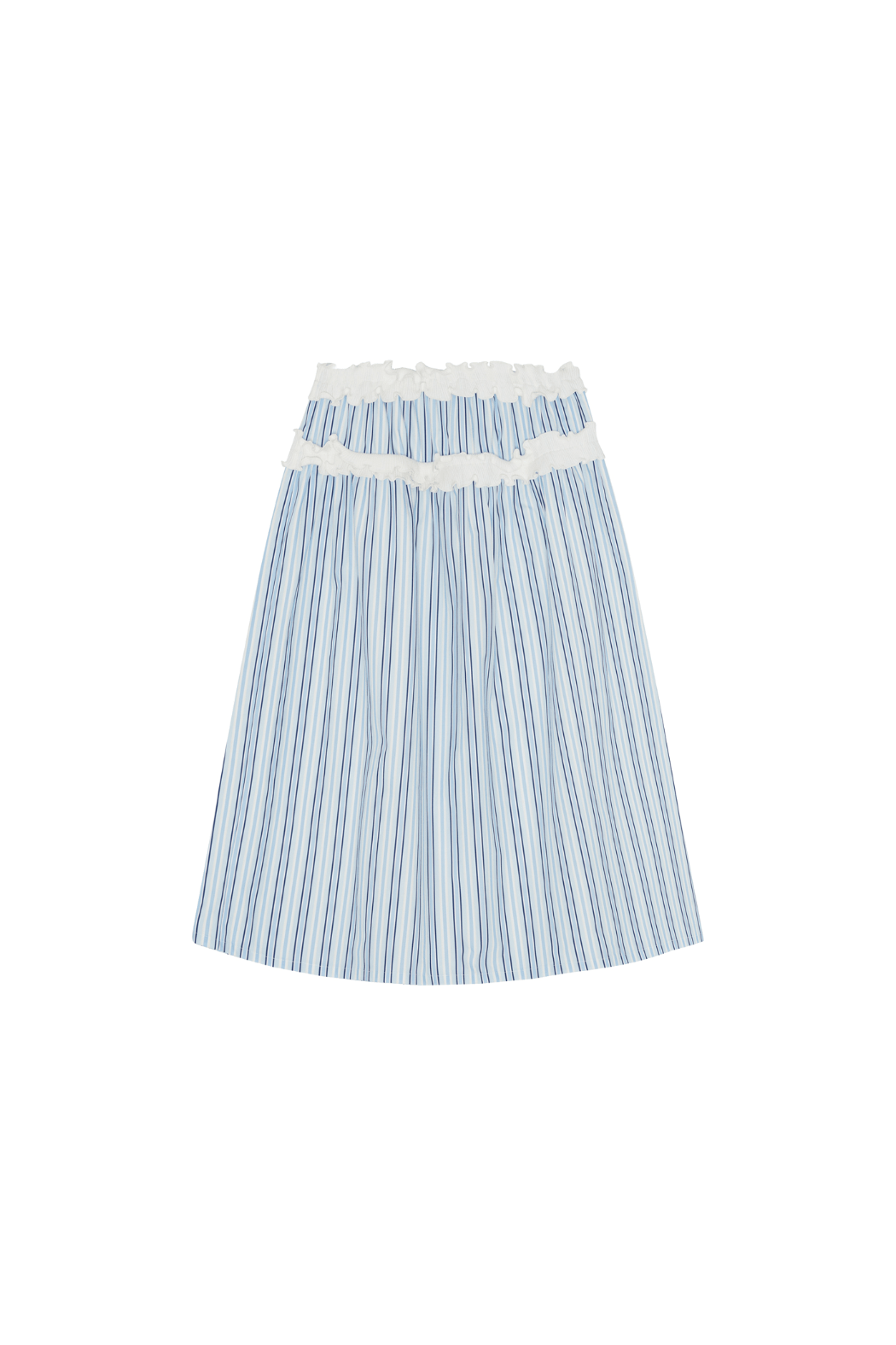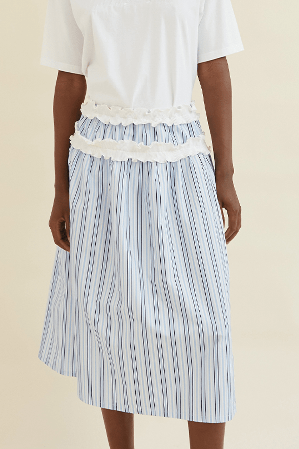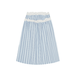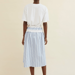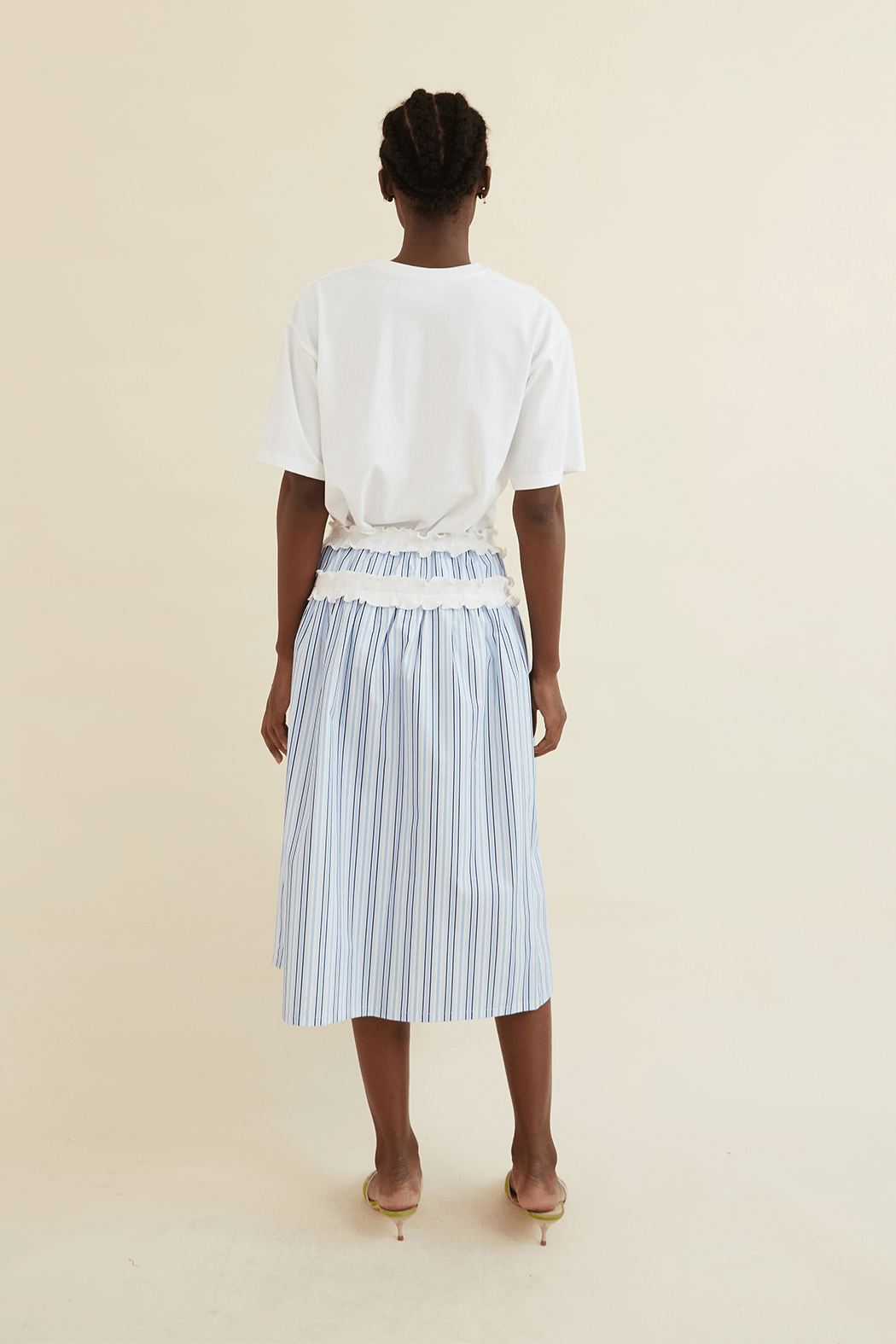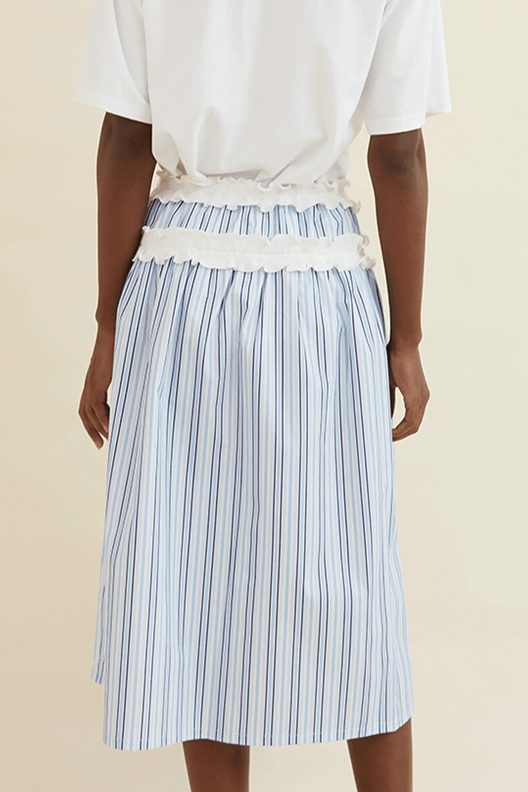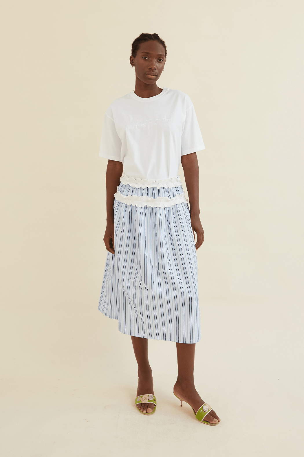 The Albertine Skirt is crafted from 100% blue striped organic cotton, offering a soft, breathable feel. This midi-length skirt has a slight ruffle design with two light blue ruffle lines around the waist, adding a playful yet elegant touch. The ruffles are made from seamless 100% recycled cotton, enhancing the skirt’s eco-friendly appeal.
