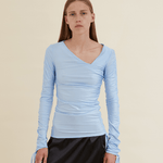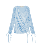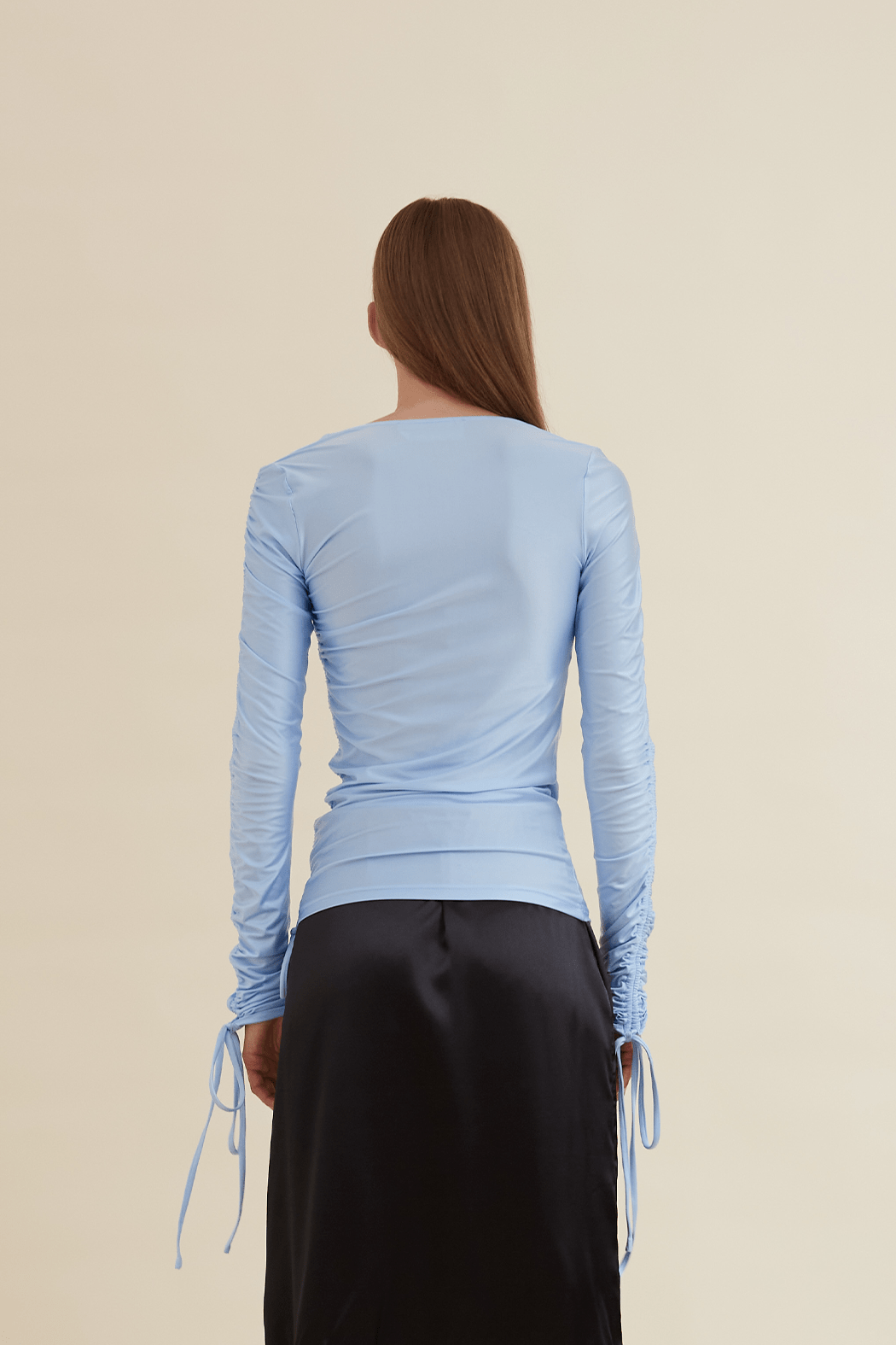 The Anais Top in sky blue is crafted from a blend of 75% recycled polyamide and 25% spandex. This fitted top features an eye-catching asymmetrical neckline and elegant ruched detailing on both sleeves. The look is completed with adjustable ties at the ends of the sleeves, adding a playful yet stylish touch.
