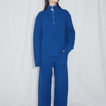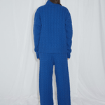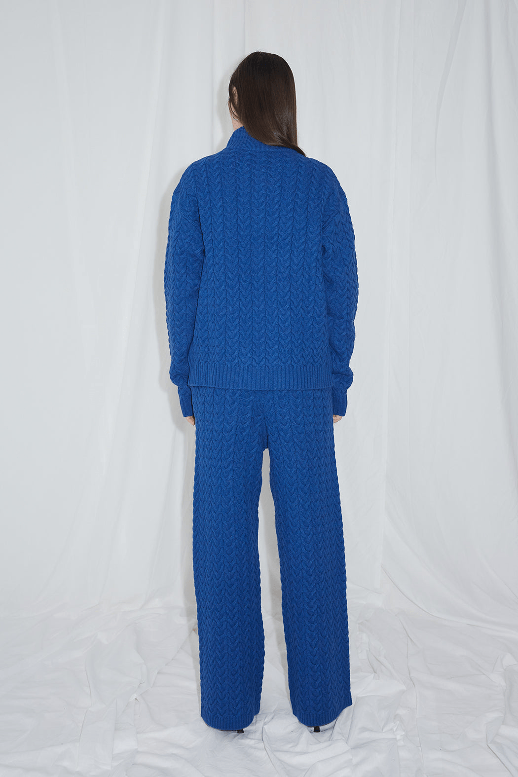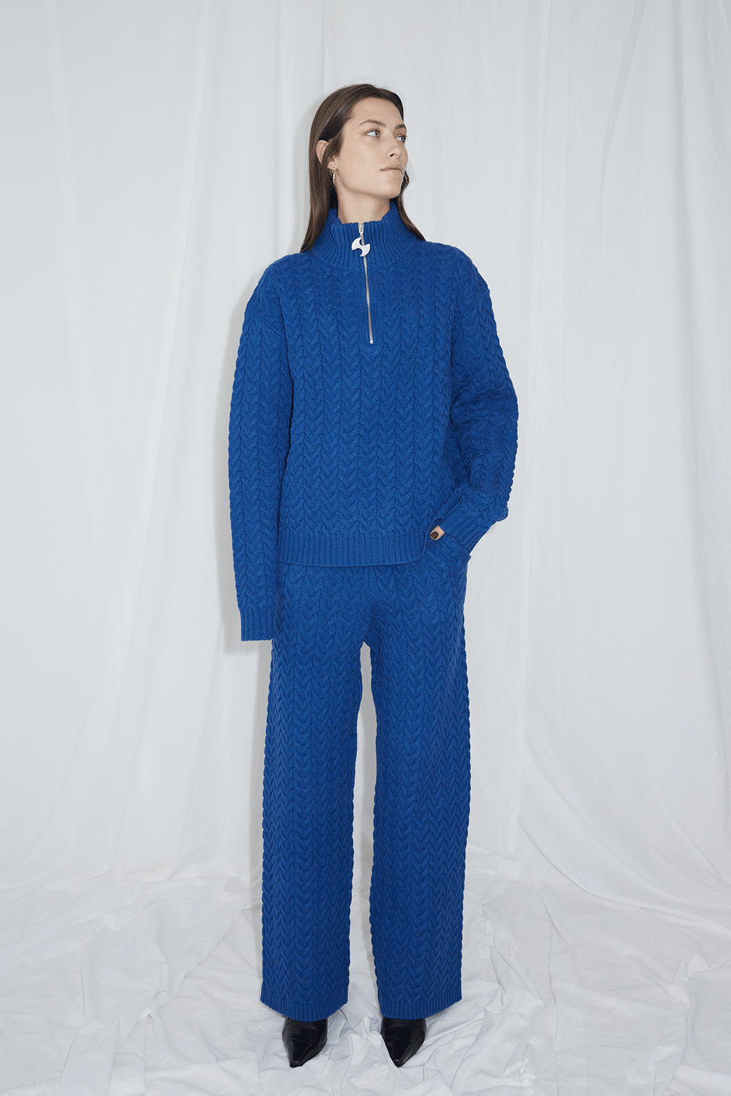 The Alyssa pants are crafted from blue cable knit in 100% recycled wool. They have a relaxed fit with long wide legs and an elasticated waistband. Style the cozy pants with the matching Jupiter sweater for a classic yet chic look for fall.
