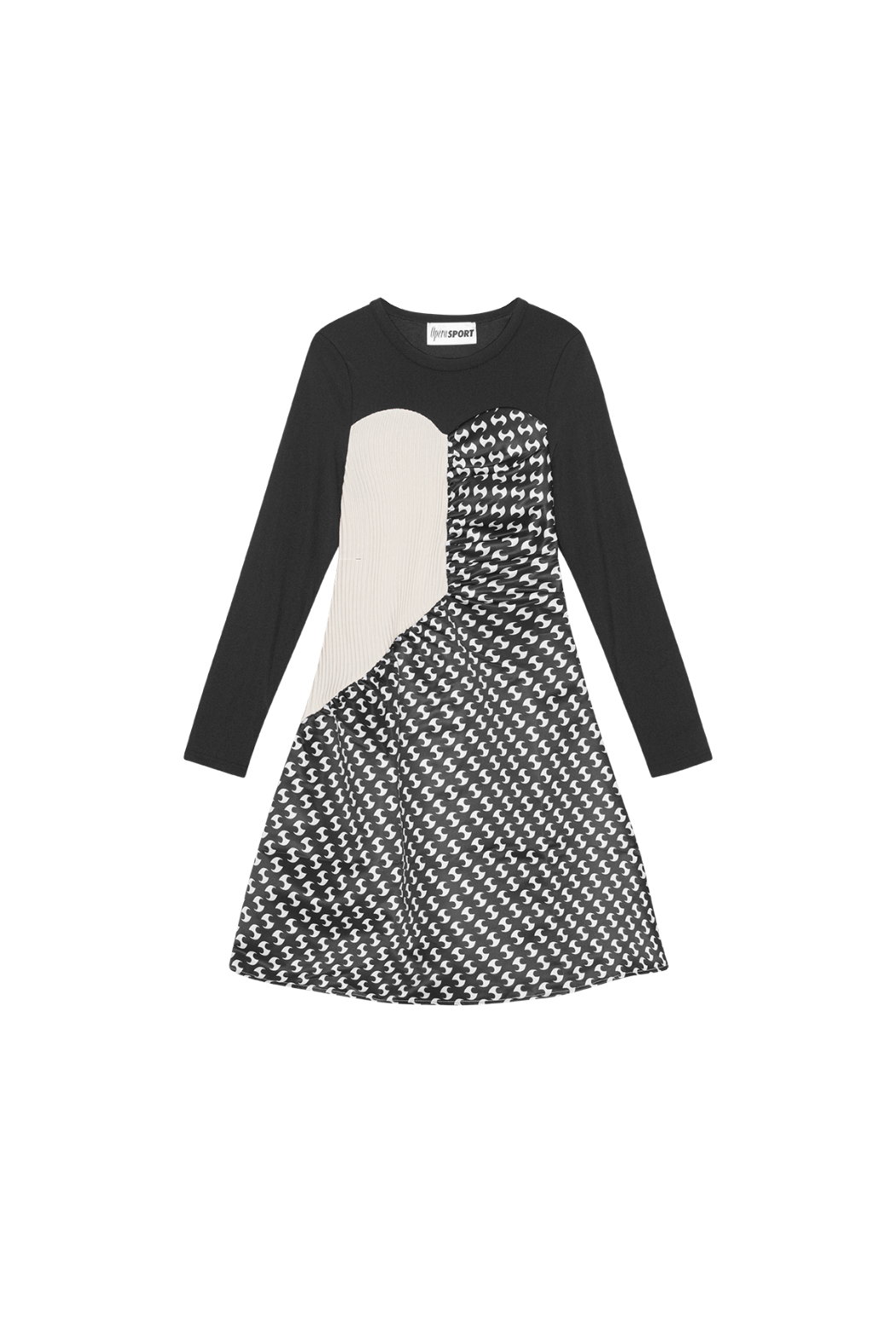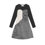 The Abigail dress is a tri-colored dress, featuring three different fabric compositions and punctuated with a bustier neckline shape. Inflected by the 1960s silhouettes, it is a clean cut A-line shift mini-dress and has a round neck, shaped to a flattering close-fitting silhouette above the waist.