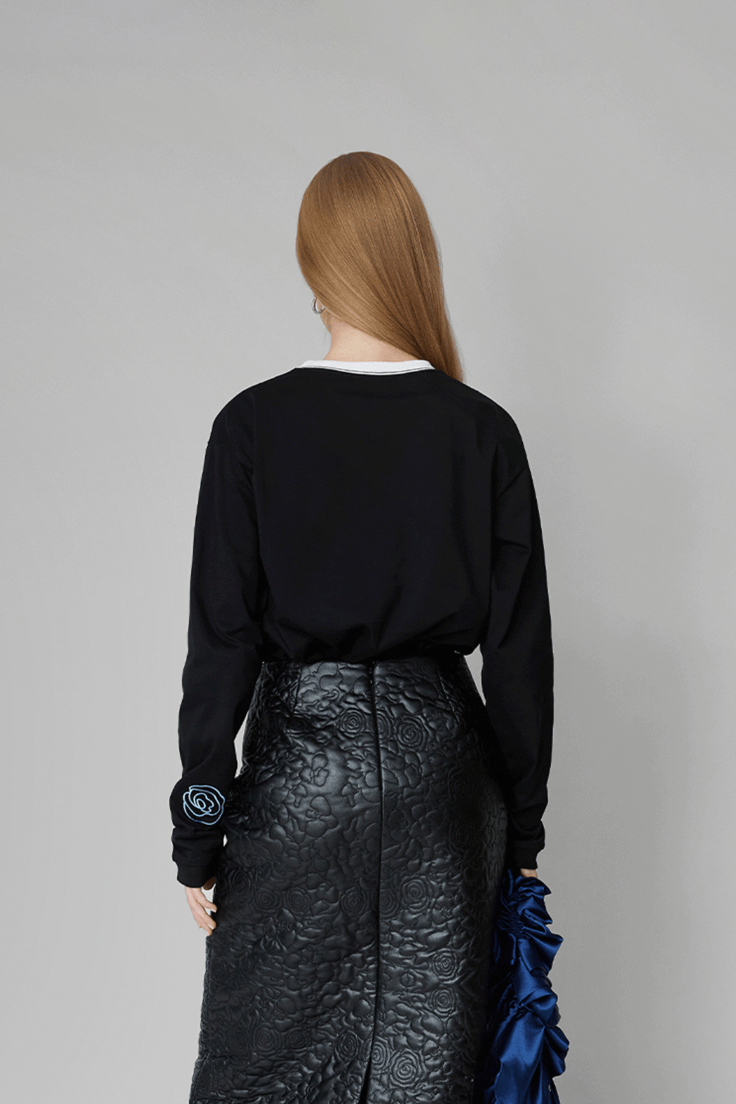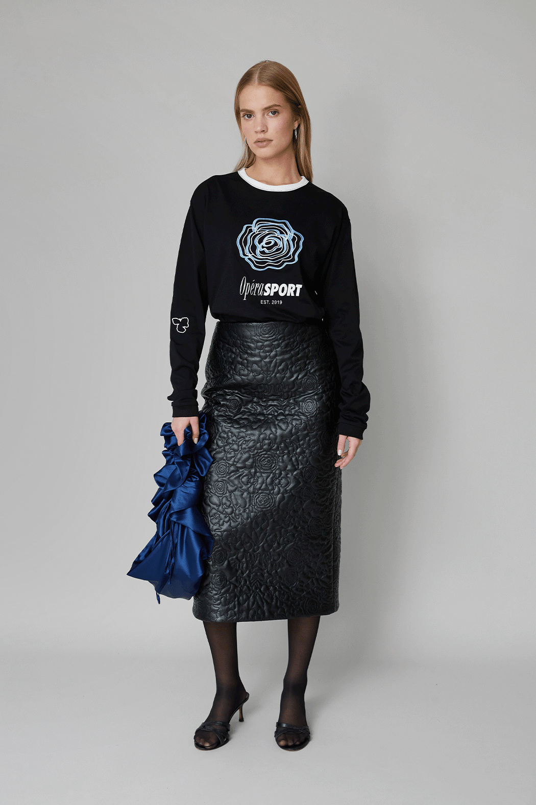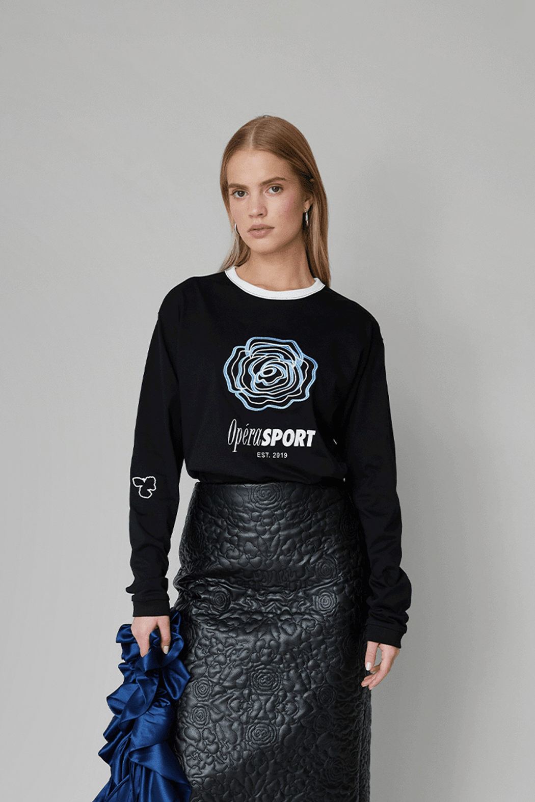 Our David Unisex Long-Sleeve T-shirt is crafted from 100% organic cotton for a soft, breathable feel. It features a relaxed, unisex fit with a white crew neckline and is adorned with an embroidered blue rose and OpéraSPORT branding across the front. Perfect for layering or wearing on its own for an effortlessly cool look.