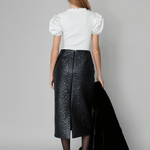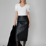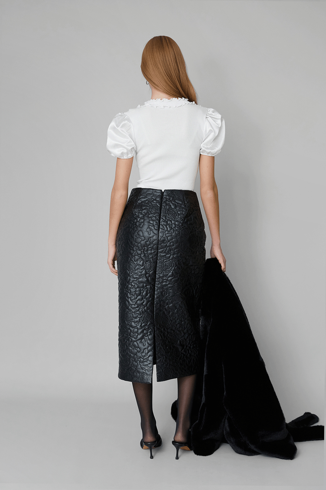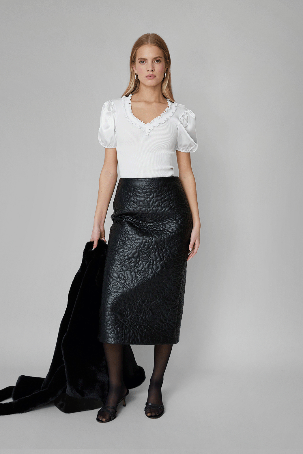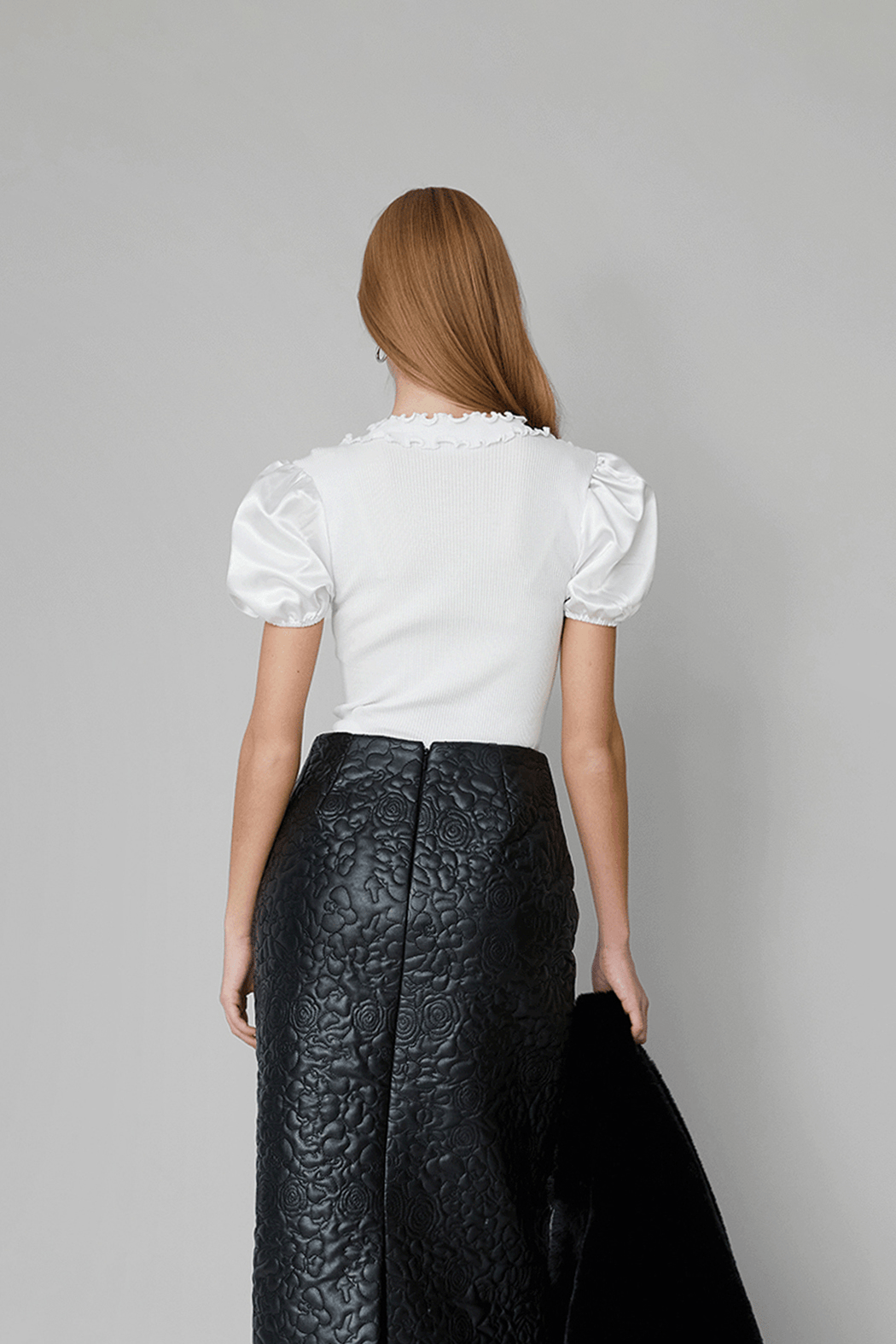 The Ingrid Top features a fitted ribbed bodice that contrasts beautifully with its voluminous puff sleeves. The neckline is adorned with a delicate ruffled trim, adding a romantic detail. This top is versatile for both everyday and elevated looks.