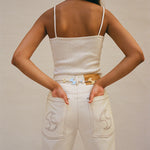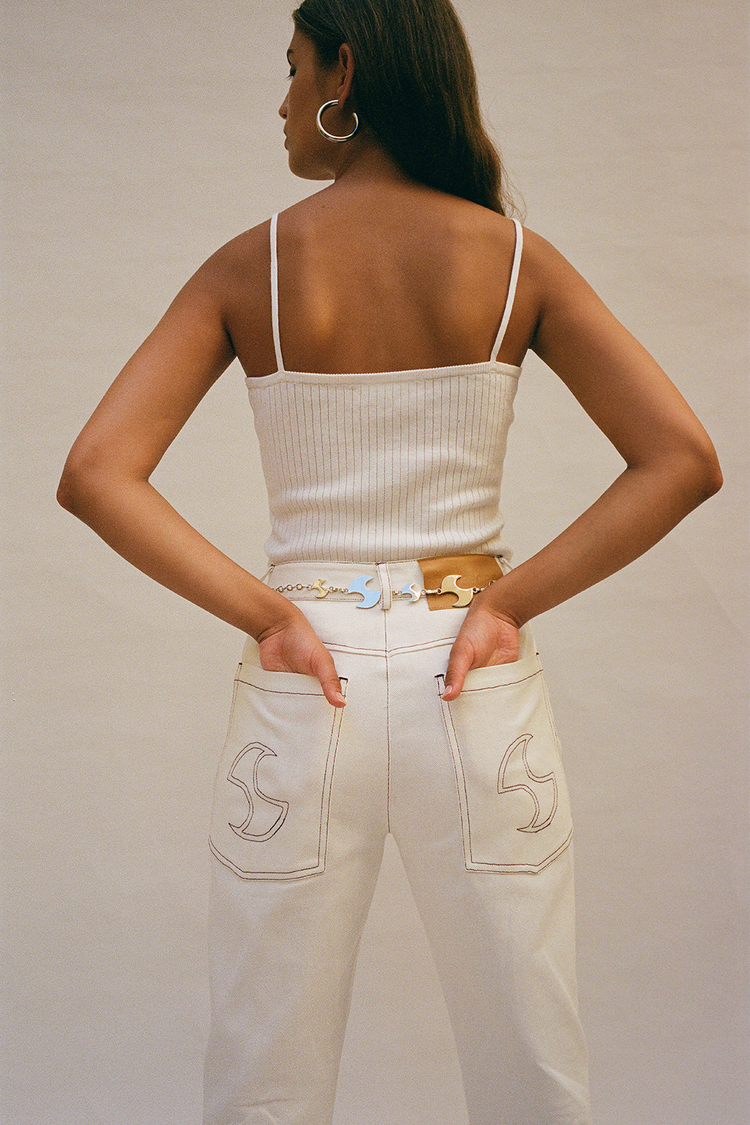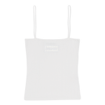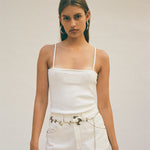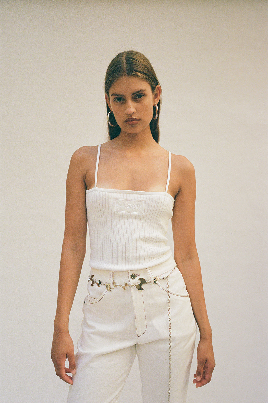 The elegant Juana top is crafted from a white rib-knitted fabric in 100% organic cotton. It has a slim-fitted silhouette and a straight-cut opening with thin spaghetti straps.