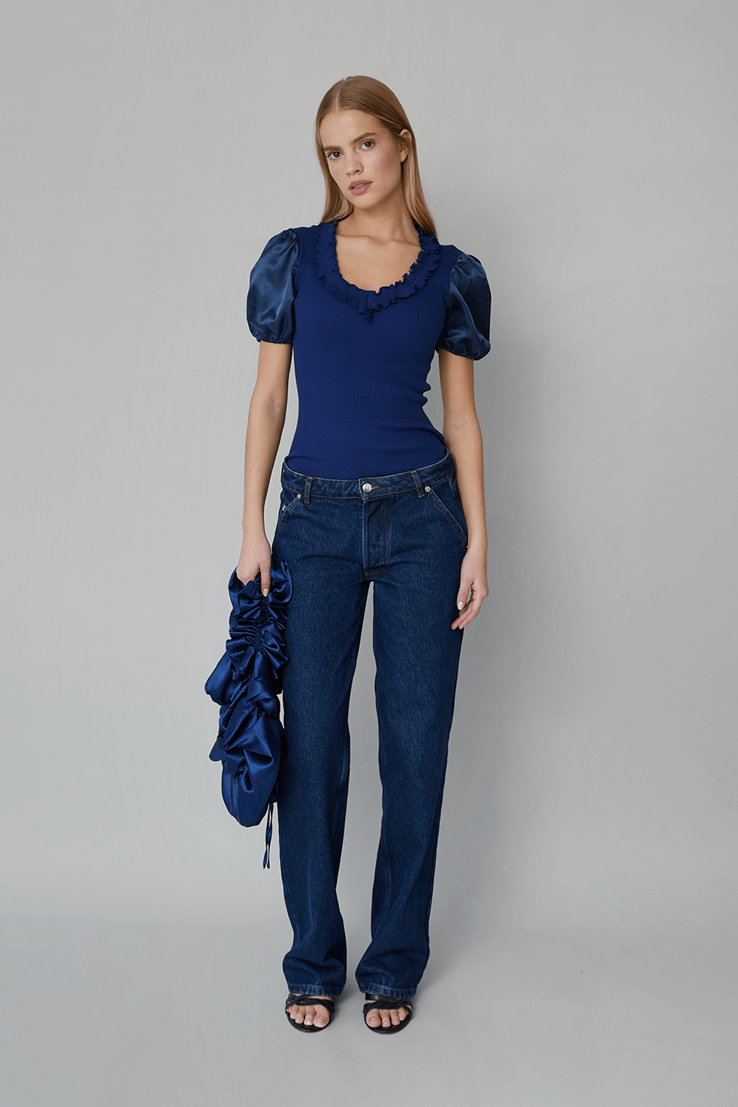 The eye-catching Shirley Bag is crafted from a luxurious blue 100% recycled polyester. Featuring an adjustable strap and ruffle detailing, it can be worn around the shoulder, crossbody, or as a handbag.