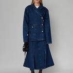 The Victoria Denim Skirt is a versatile wardrobe essential, crafted from 100% organic cotton. Designed with a high rise waist and a A-line silhouette, it elegantly flares out, offering ease of movement and a flattering fit. The skirt is detailed with tonal stitching and features a button and zip closure for a classic denim finish.