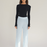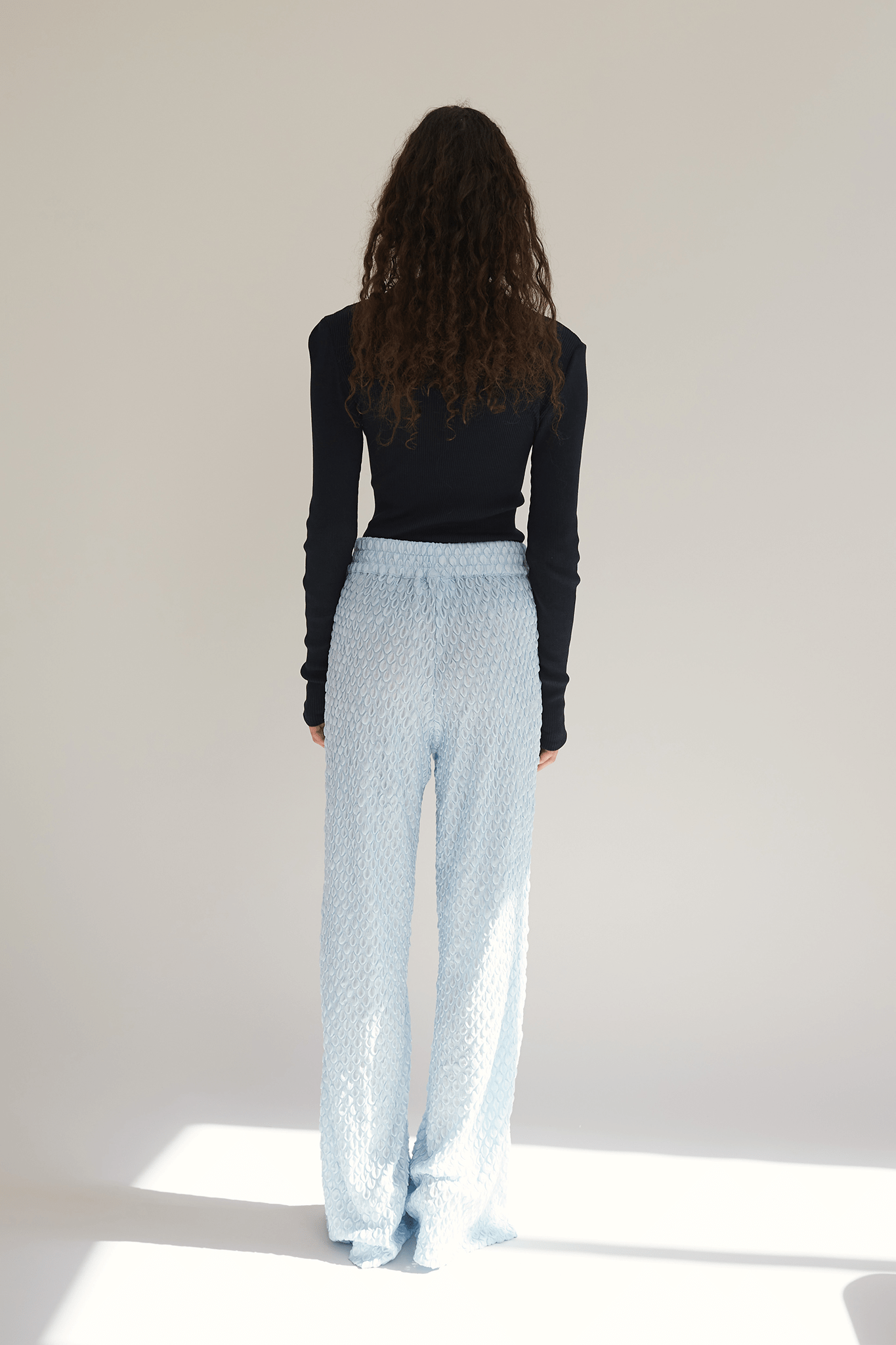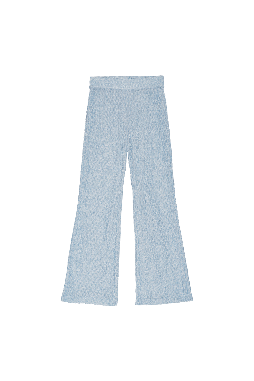 The eye-catching Martina trousers are crafted from a light blue material with a playful structure. They feature a loose fit with long wide legs and an elasticated waistband. Style them with the matching Marilene shirt for a tone-in-tone look.