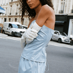 This 90's dusty blue corset with lace-up fastening in the back looks great with a pair of jeans or matching blue pants.