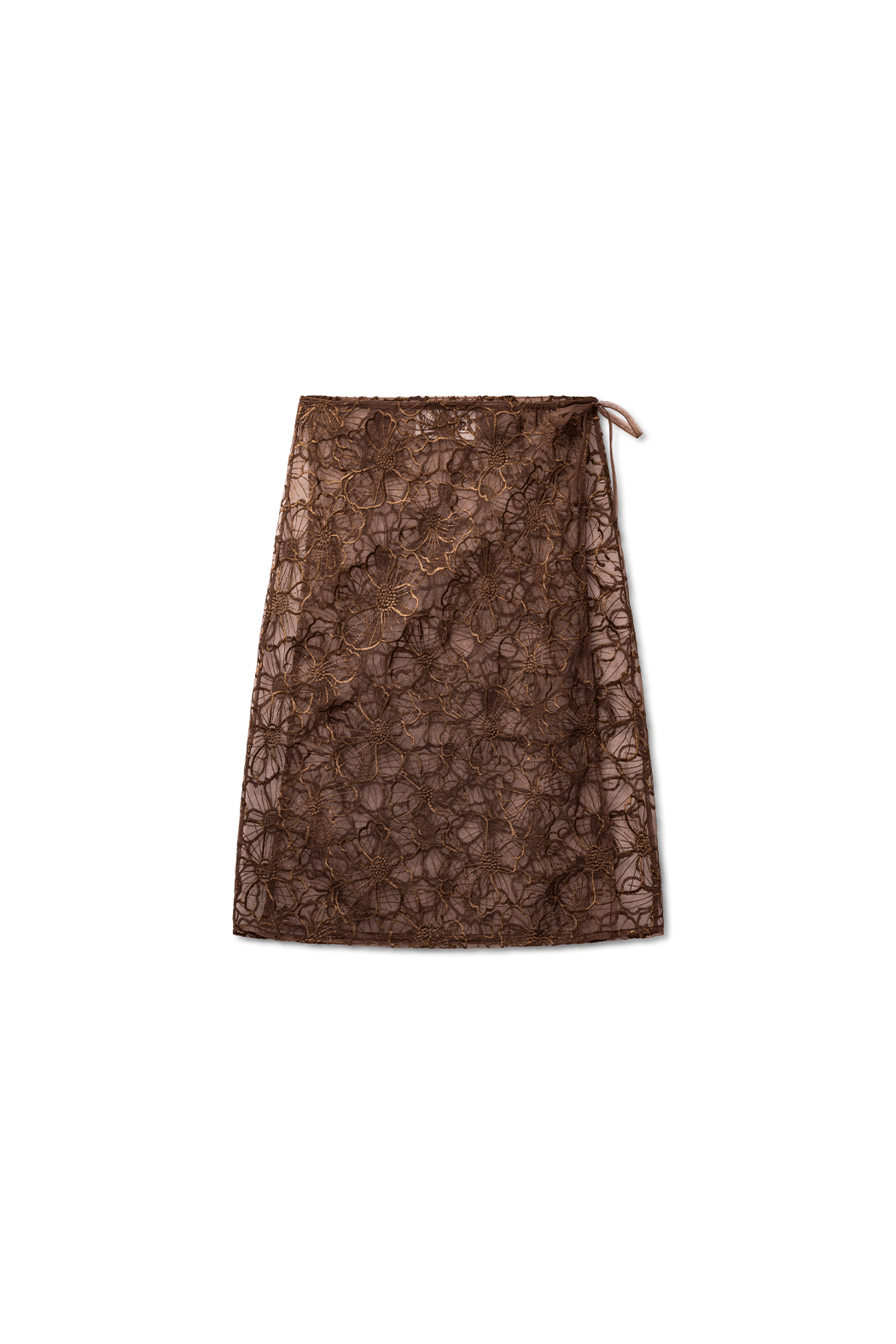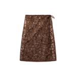 The stunning lacy Alba long skirt in brown is crafted from 100% recycled polyester. It has a wraparound design and elongated ties for a feminine bow. The skirt can be worn over tights or trousers as well as with less underneath for a bolder look.