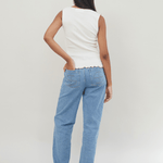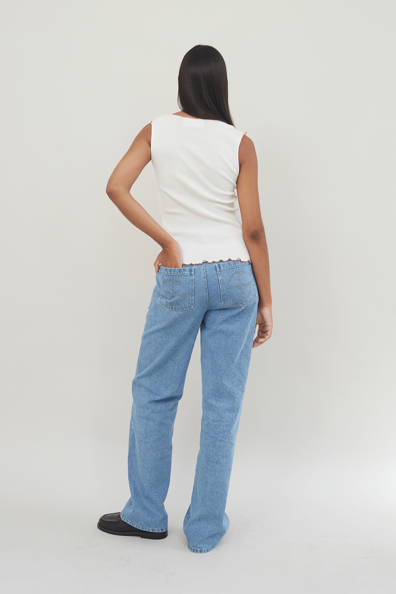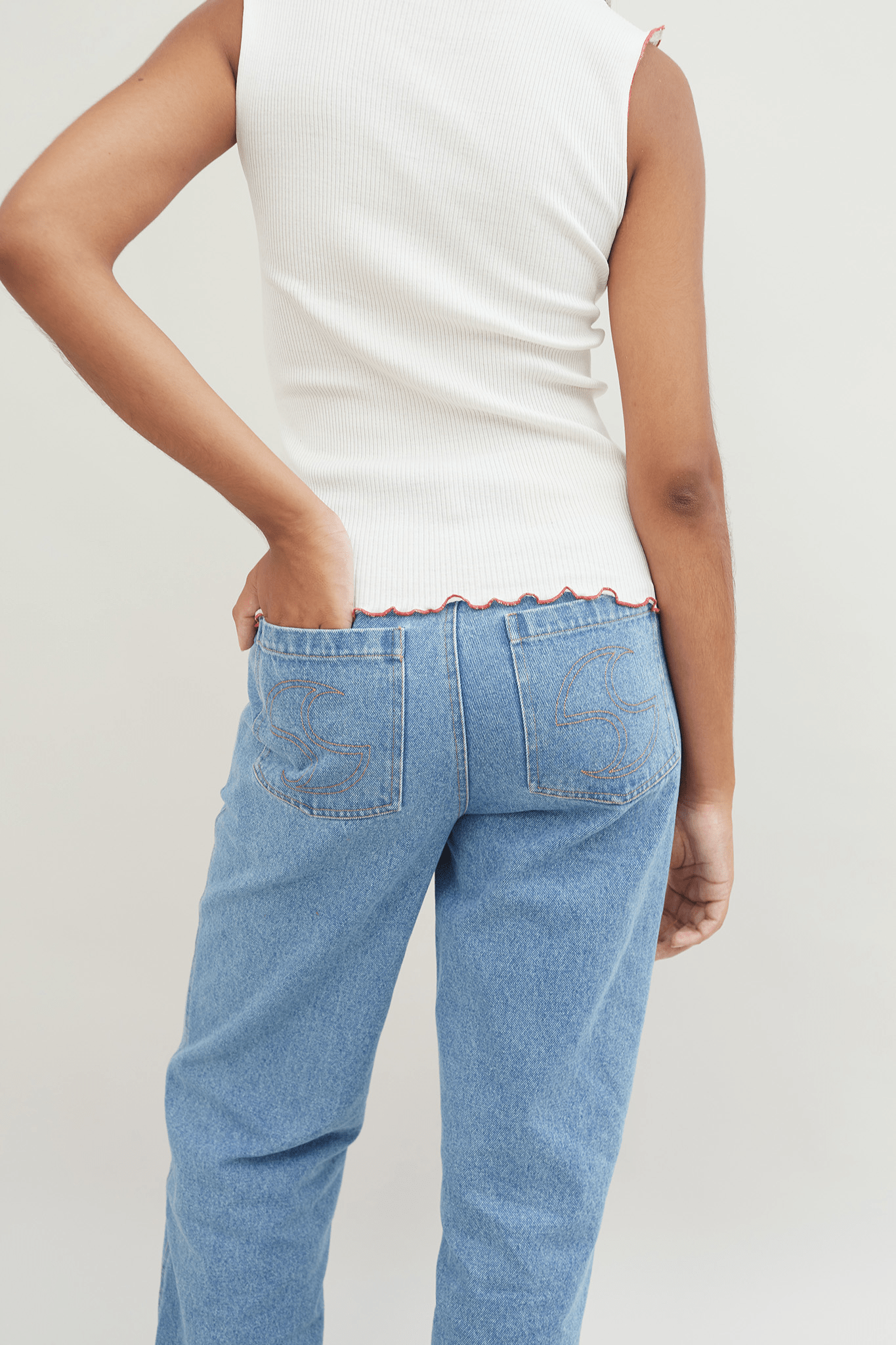 The Bay Jeans are made from 100% recycled cotton. They are high-waisted with long slightly loose legs and two pockets both on the front and back. Your perfect pair of everyday jeans that are also easy to dress up.